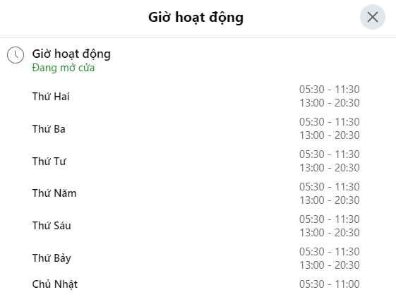 • Thời gian mở cửa: Từ 5h30 sáng đến 20h30 tối – phù hợp cho cả người đi làm sớm, sinh viên, người tập chiều và nhóm tập đêm