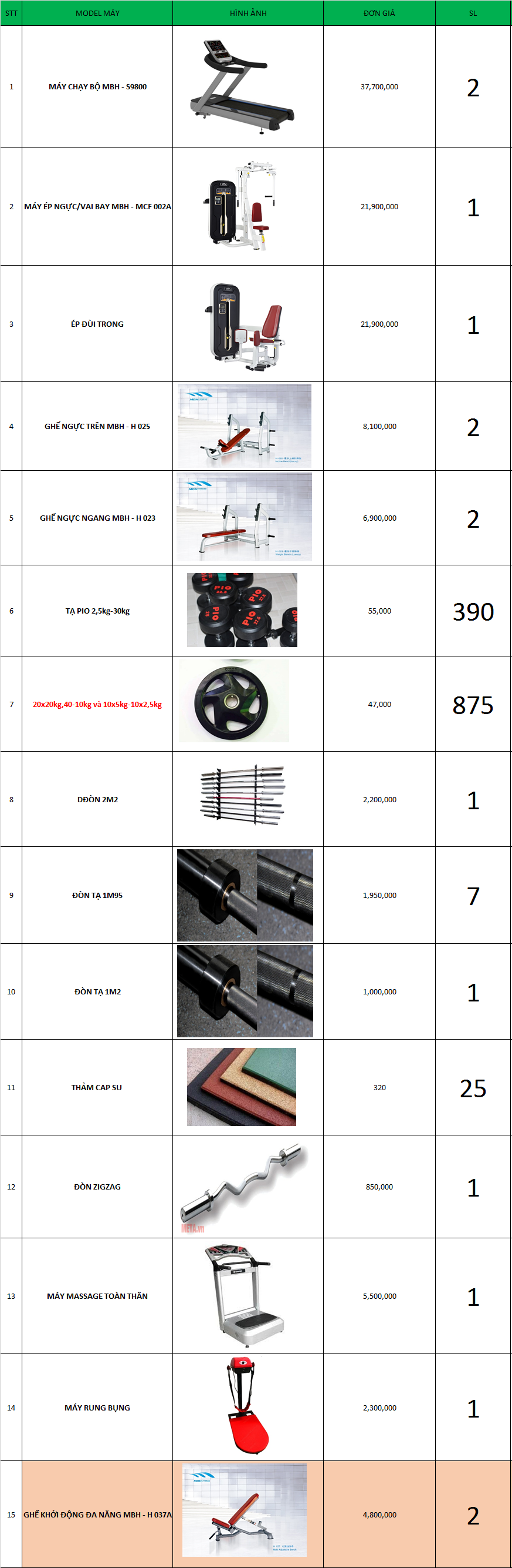 BẢNG GIÁ MÁY VÀ SỐ LƯỢNG MÁY MBH SETUP PHÒNG GYM 250M2 TẠI VĨNH PHÚC
